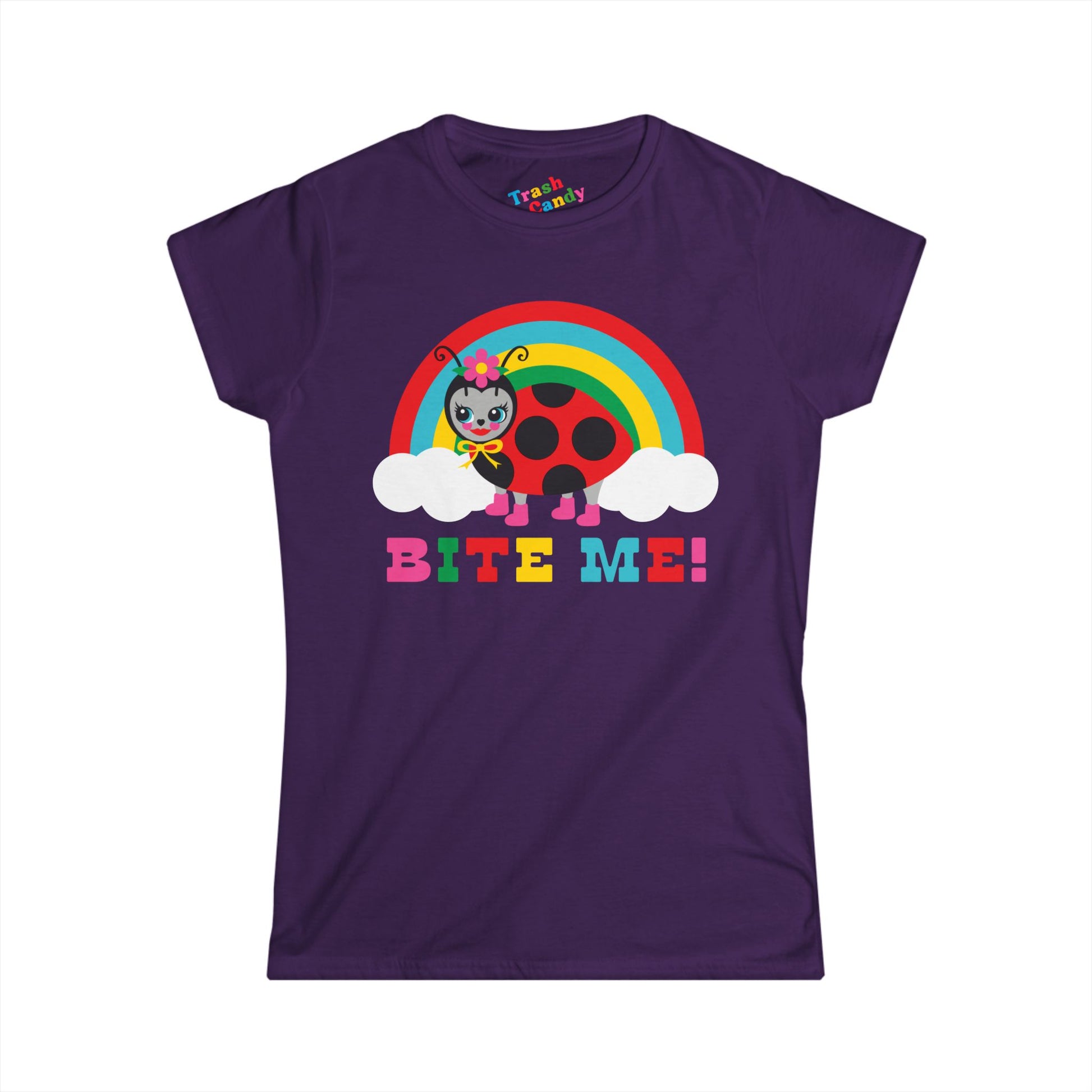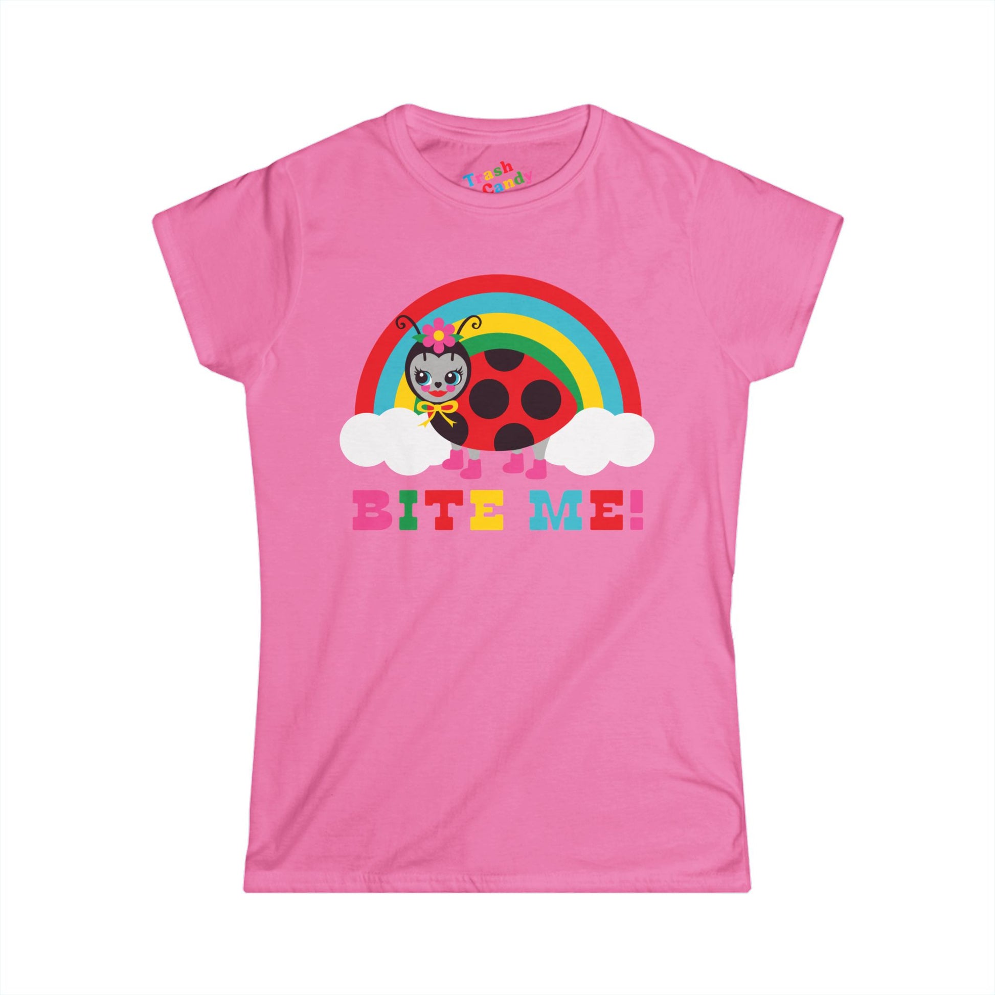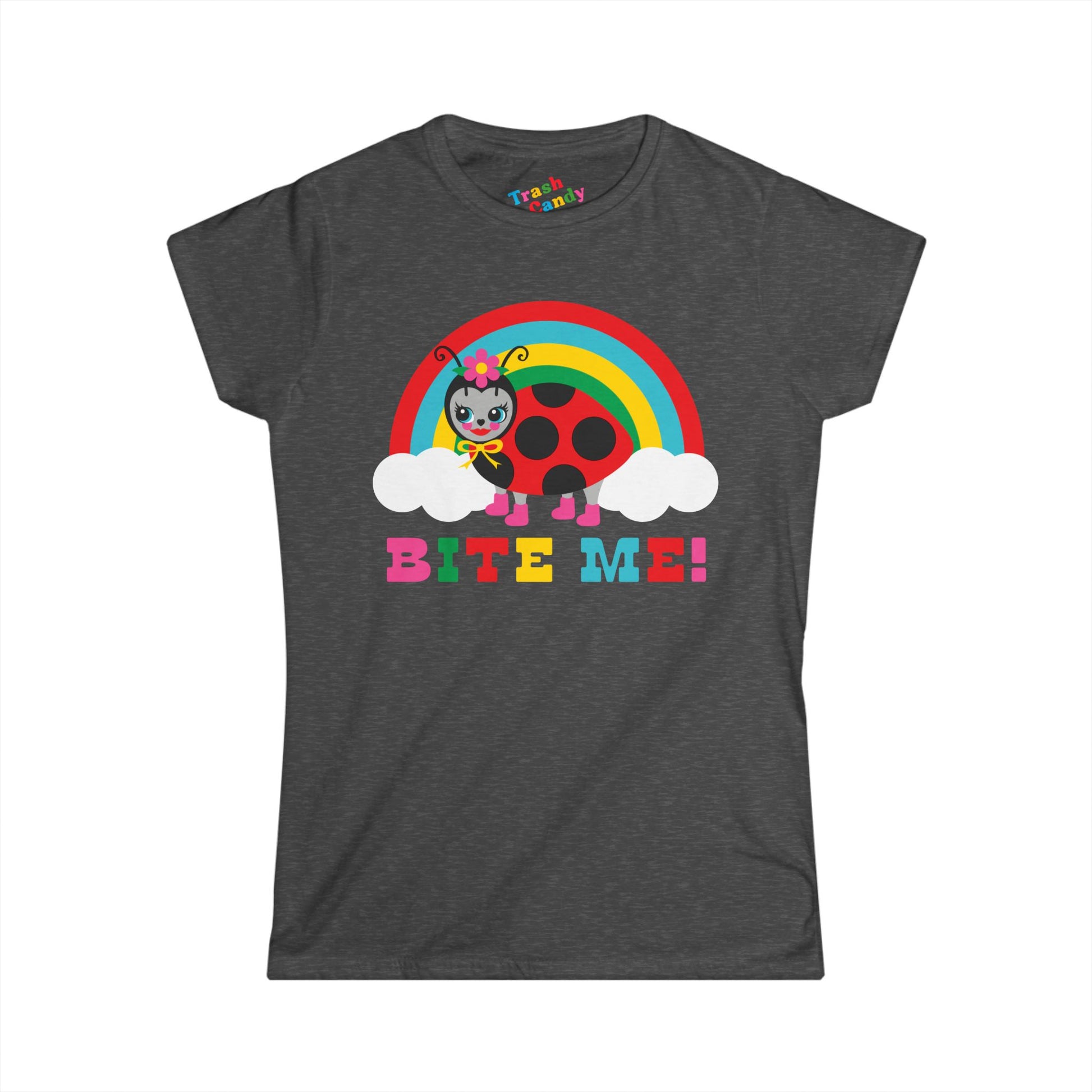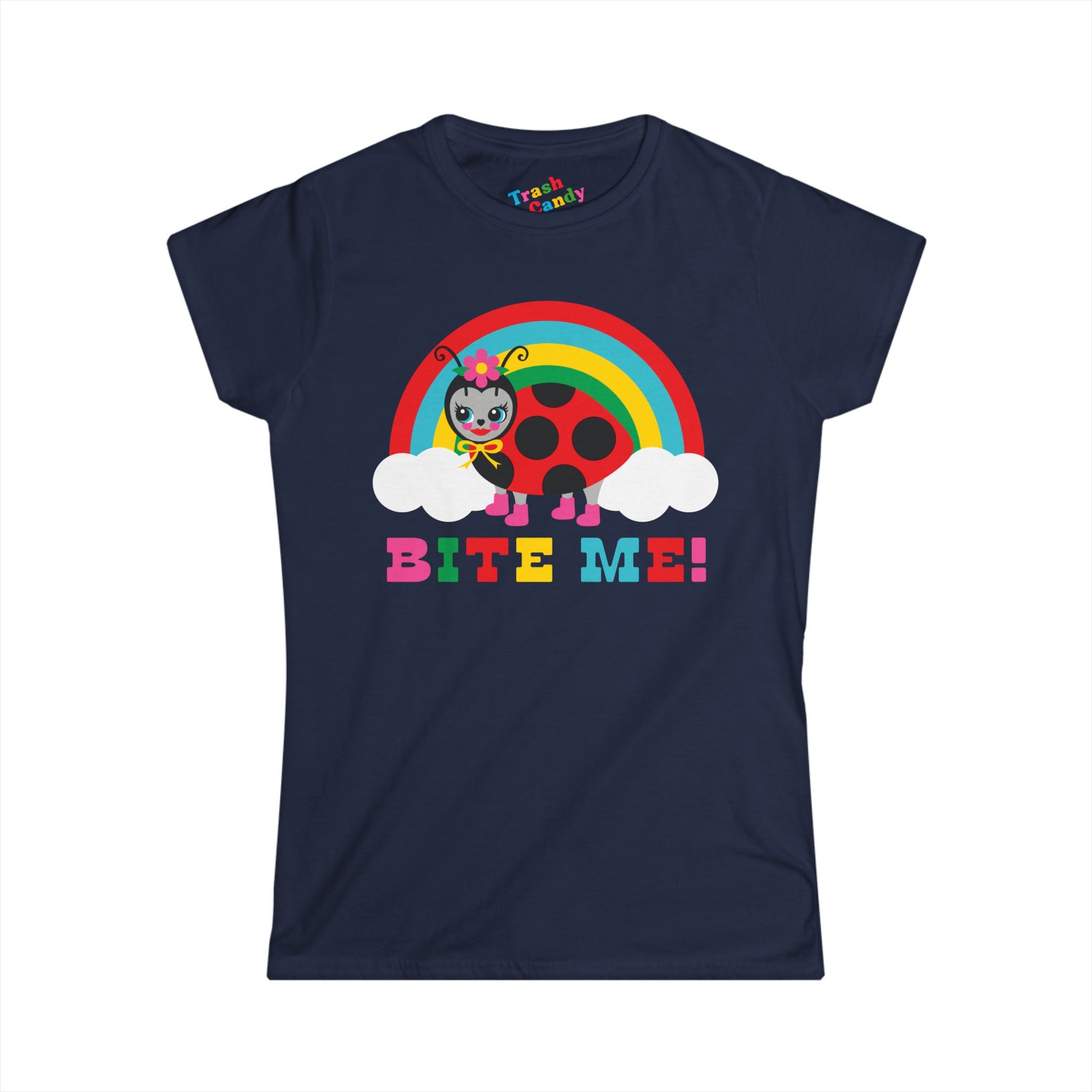 Bite Me - cute ladybug women's tee, featuring our exclusive Punky Tails character - "Rude Judy!" Also available in unisex sizes.