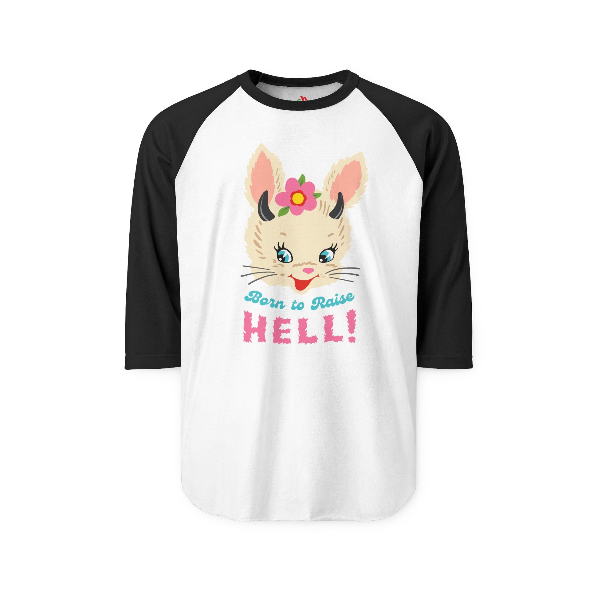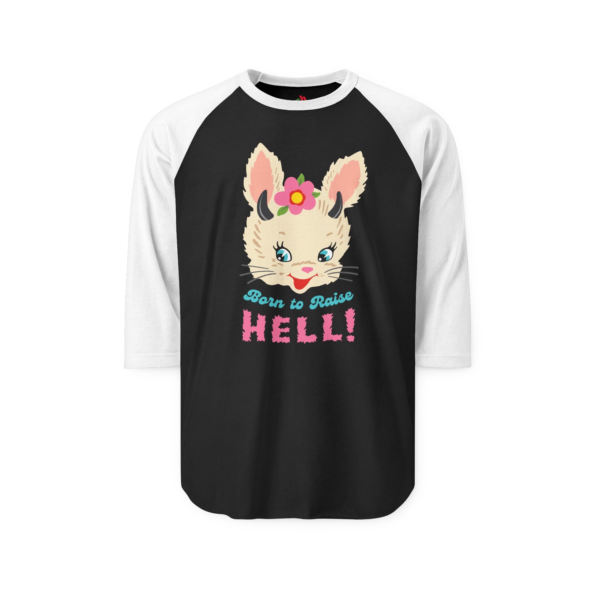 Born to Raise Hell - cute bunny unisex baseball tee, featuring our exclusive Punky Tails character - "Jellybean!"