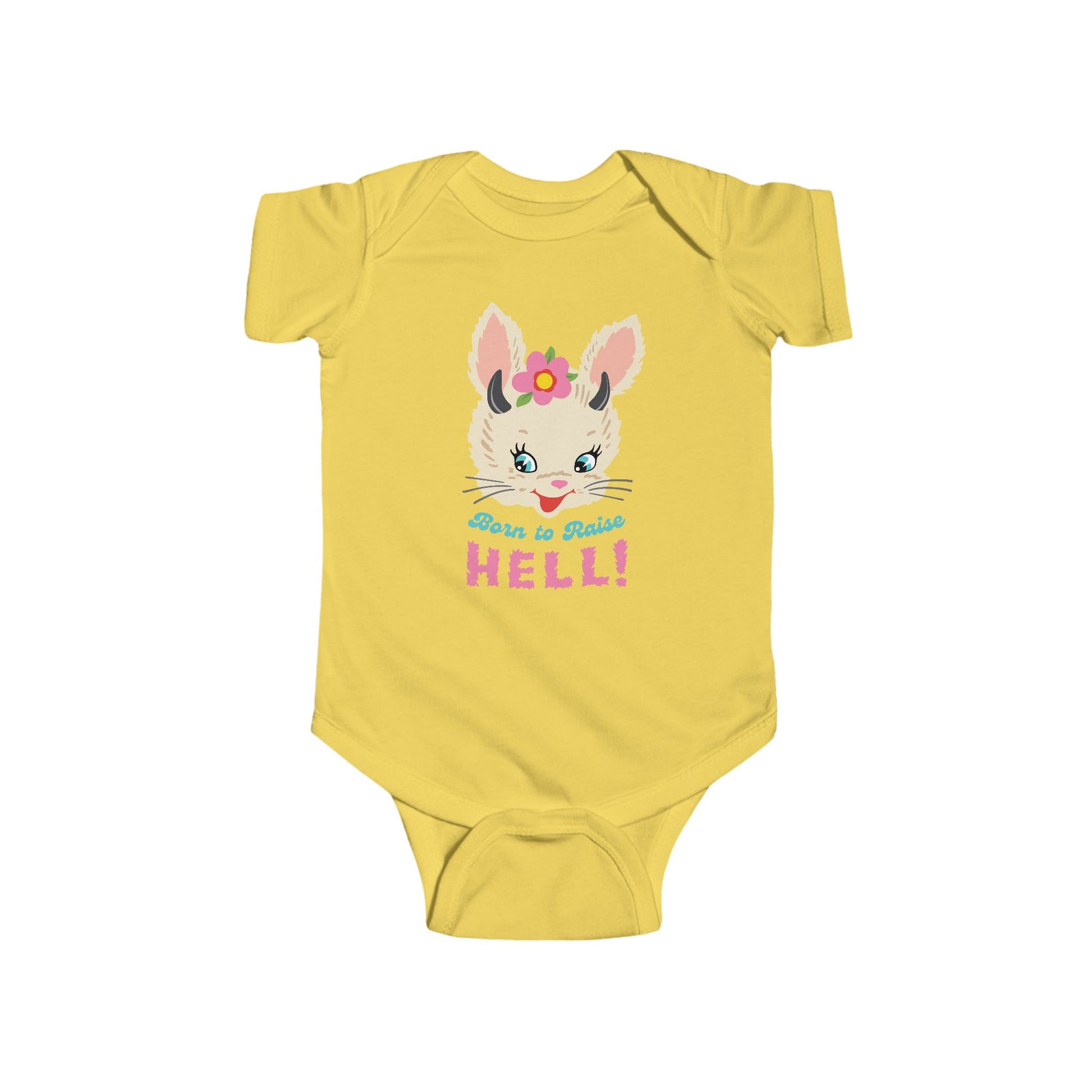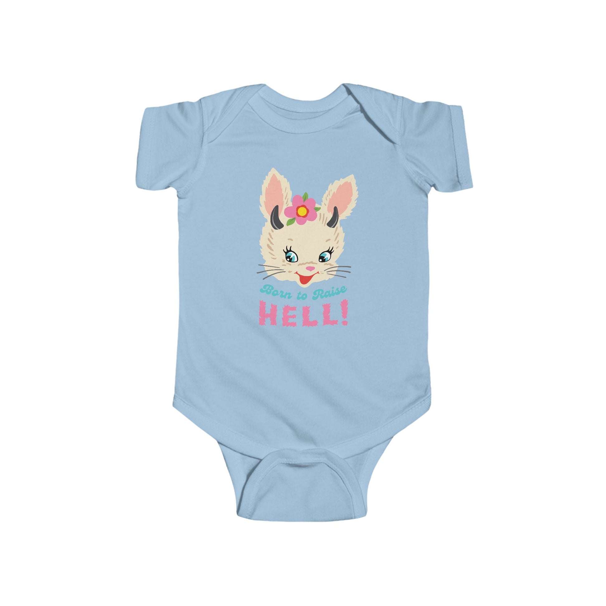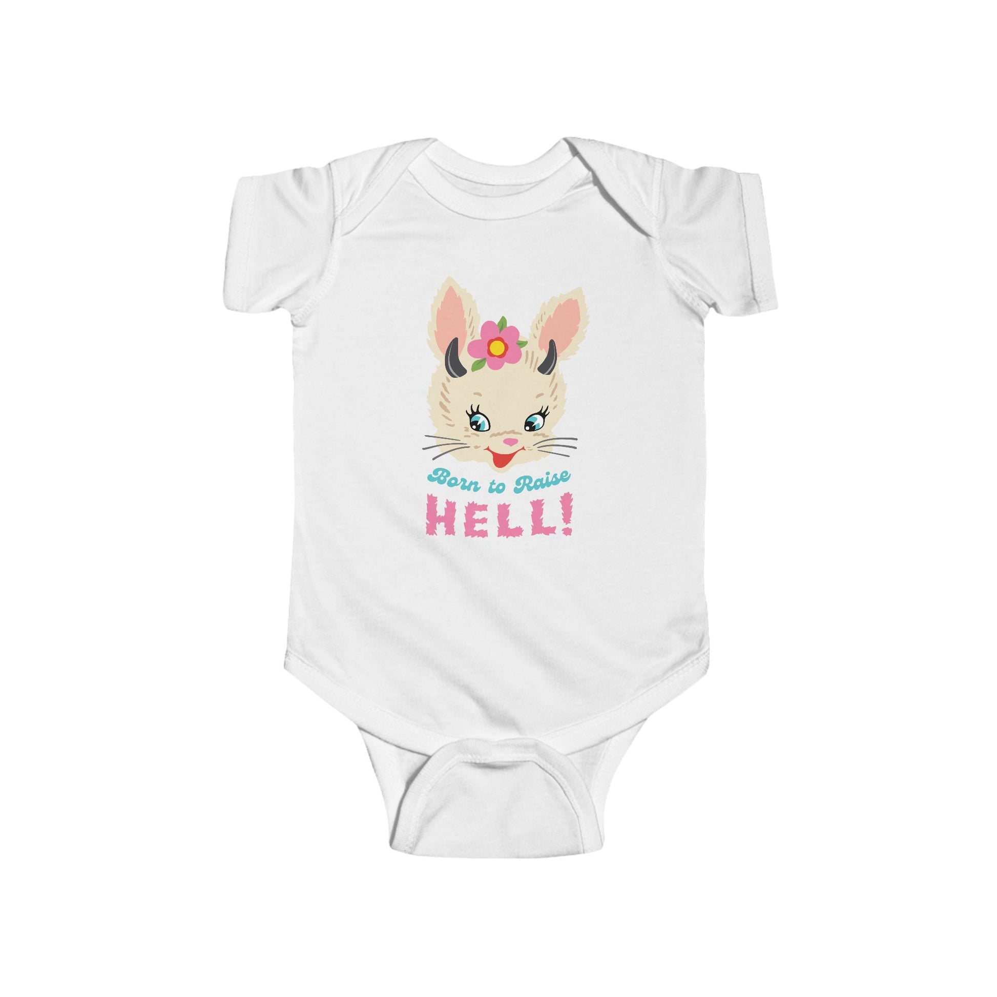 Born to Raise Hell - cute bunny baby bodysuit! This bodysuit features our exclusive Punky Tails character, "Jellybean."