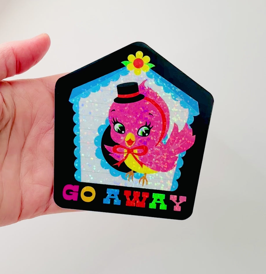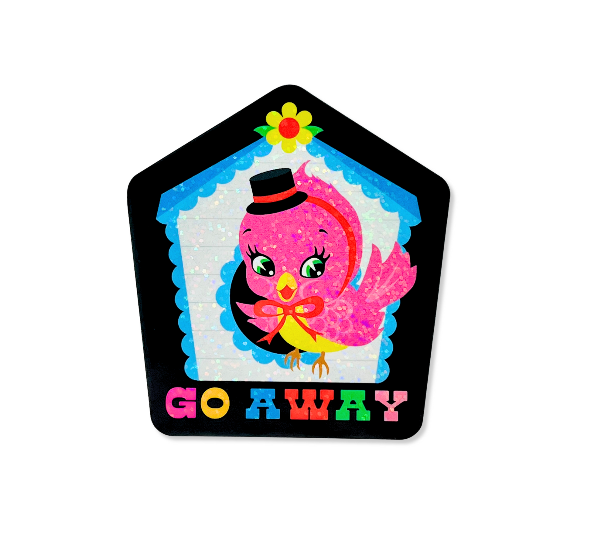 Go Away - cute, sparkly glitter sticker! This is a 3 1/2 inch durable waterproof sticker - suitable for indoor or outdoor use. This sticker features our exclusive Punky Tails character - "Raspberry Ruckus."