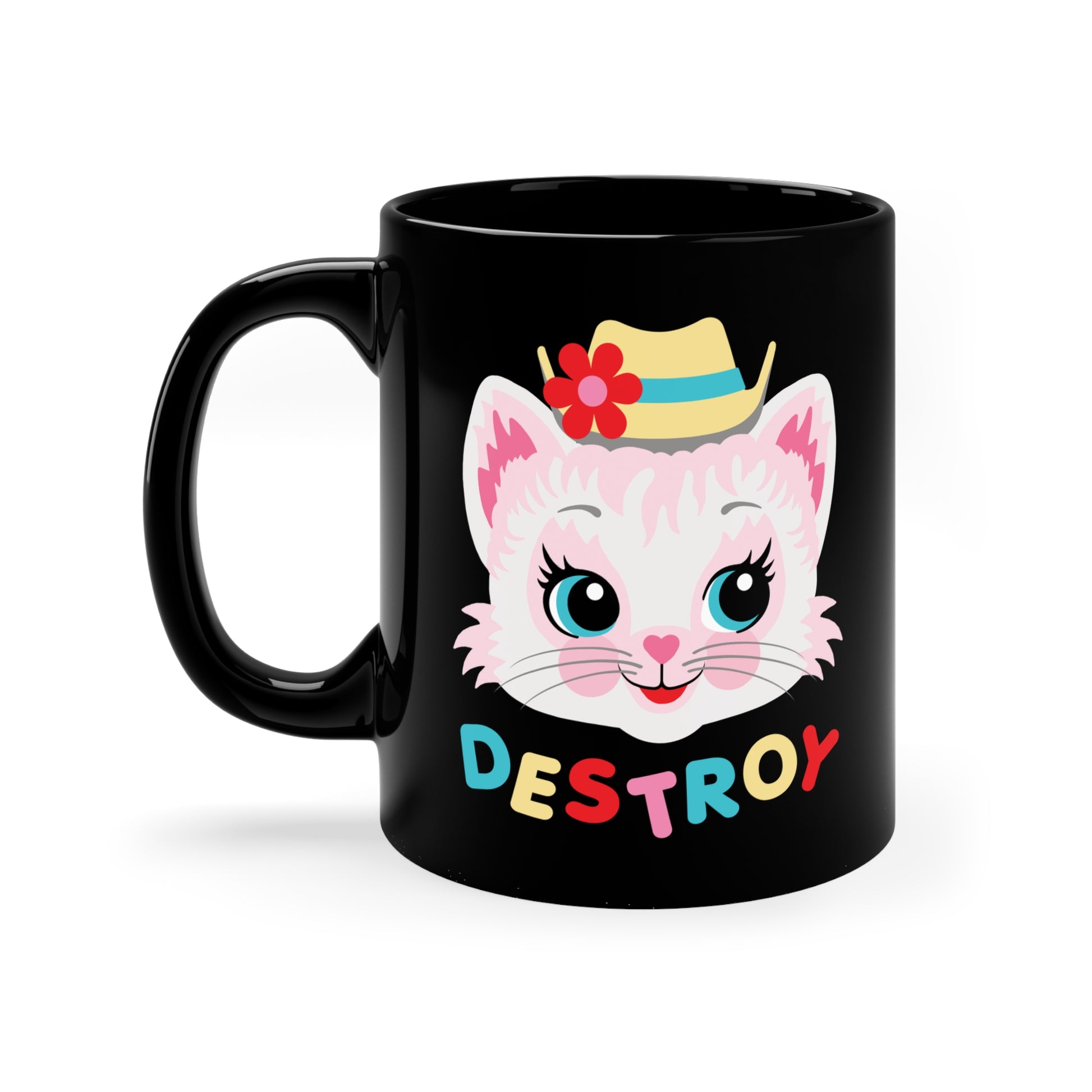 Destroy - cute retro black ceramic mug! This design features our exclusive Punky Tails character - "Mad Marshmallow."