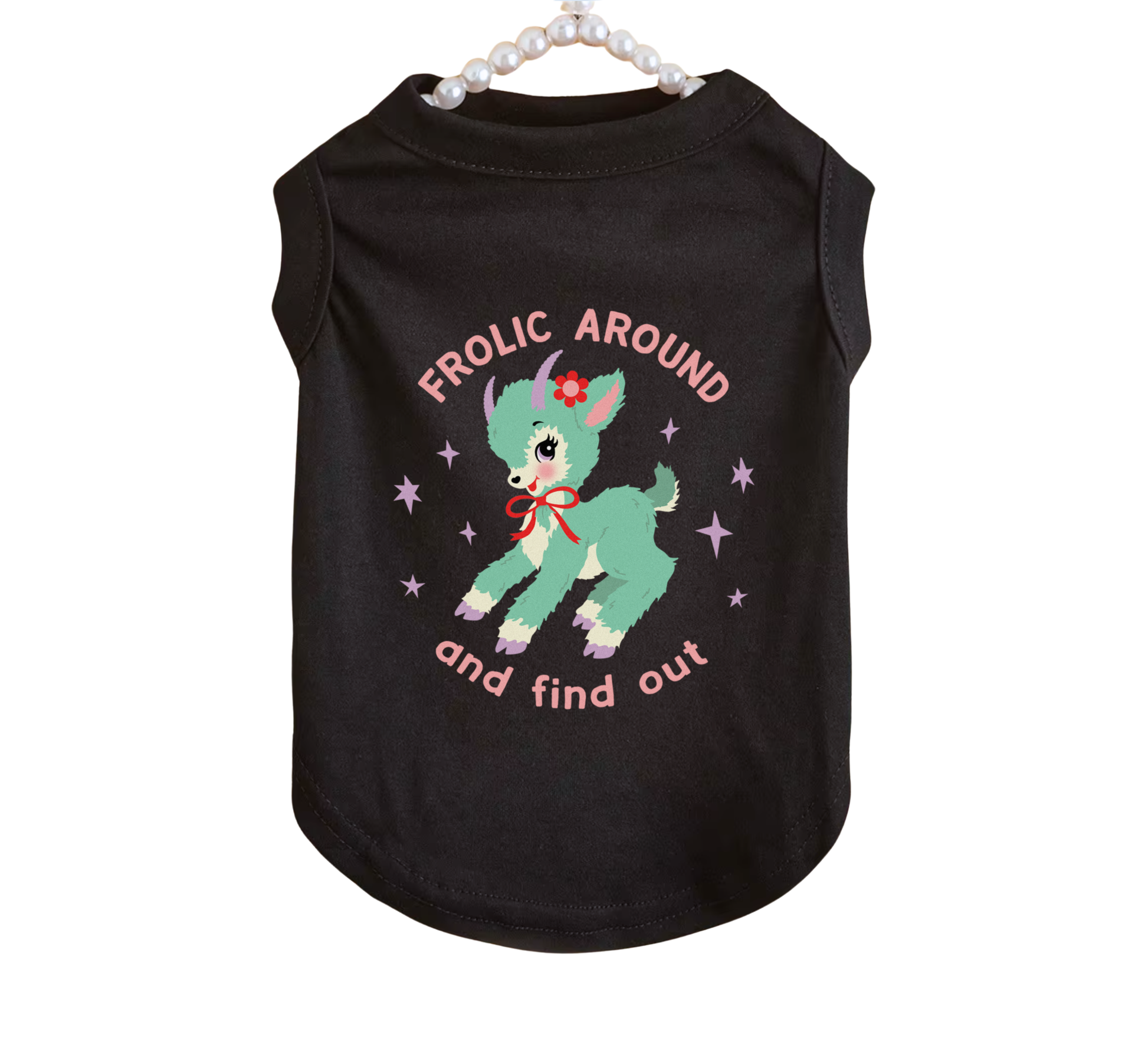 Frolic Around and Find Out - cute pet t-shirt! These 65% cotton/35% poly blend pet tees are super soft and comfy! This design features our exclusive Punky Tails character, "Jasper Jawbreaker."