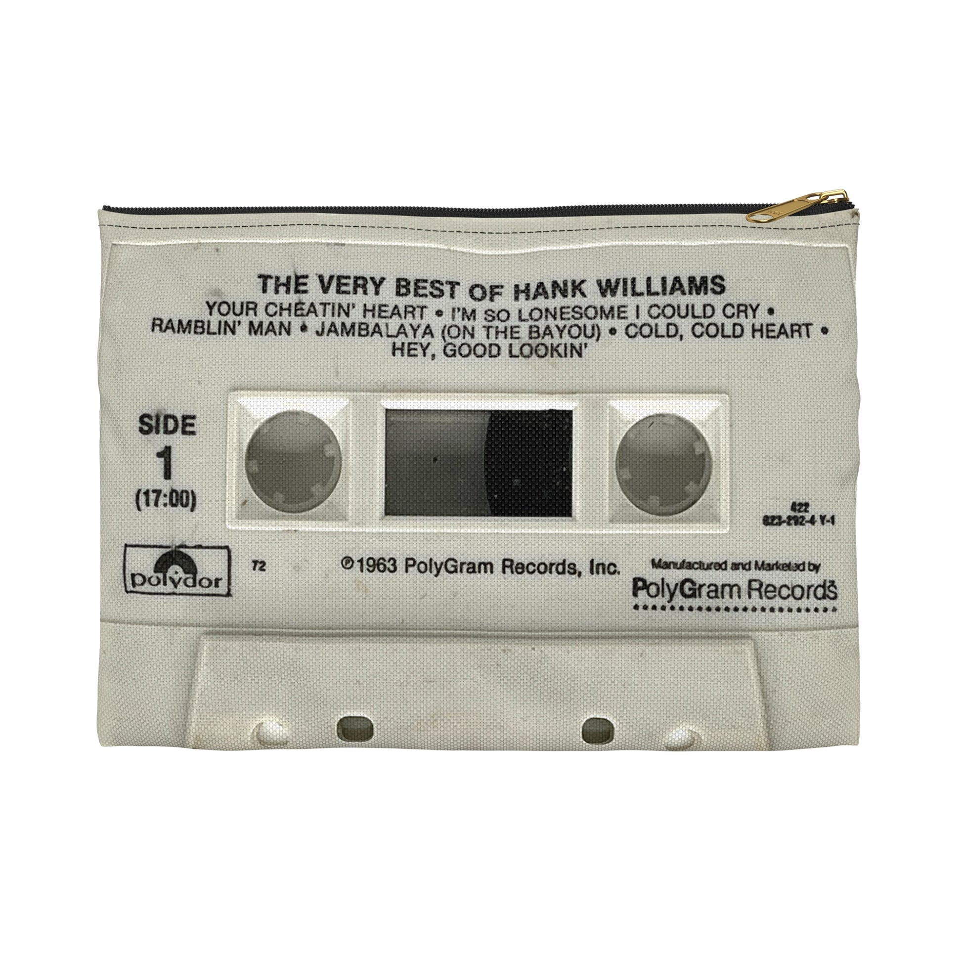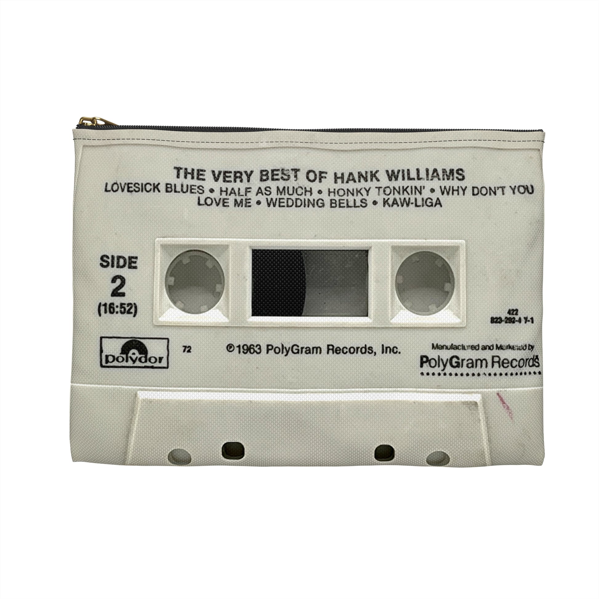 Hank Williams - Best Of - cassette tape zipper pouch! This is a great sized pouch at 8" x 6", perfect for holding a few tapes of your own! Side A is on one side, and side B is on the other side. This image is taken from my own personal collection of tapes that I've had since the 80's (that have been lovingly played hundreds of times) and thus THERE WILL BE VISIBLE "FLAWS" IN THE PRINT, like smudges, scuffs and dirt.