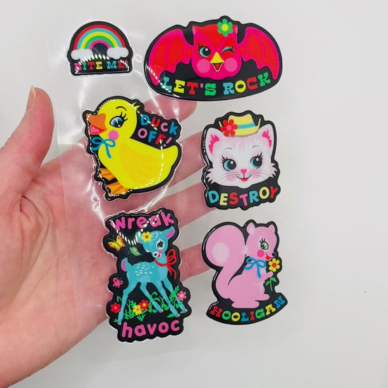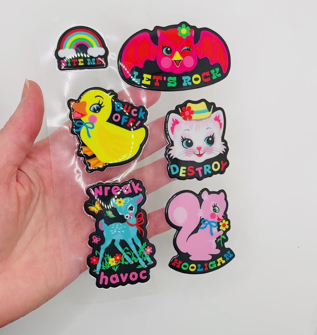 These retro puffy stickers are super bright and vibrant! Included on this sticker sheet are six of our most popular designs, including: