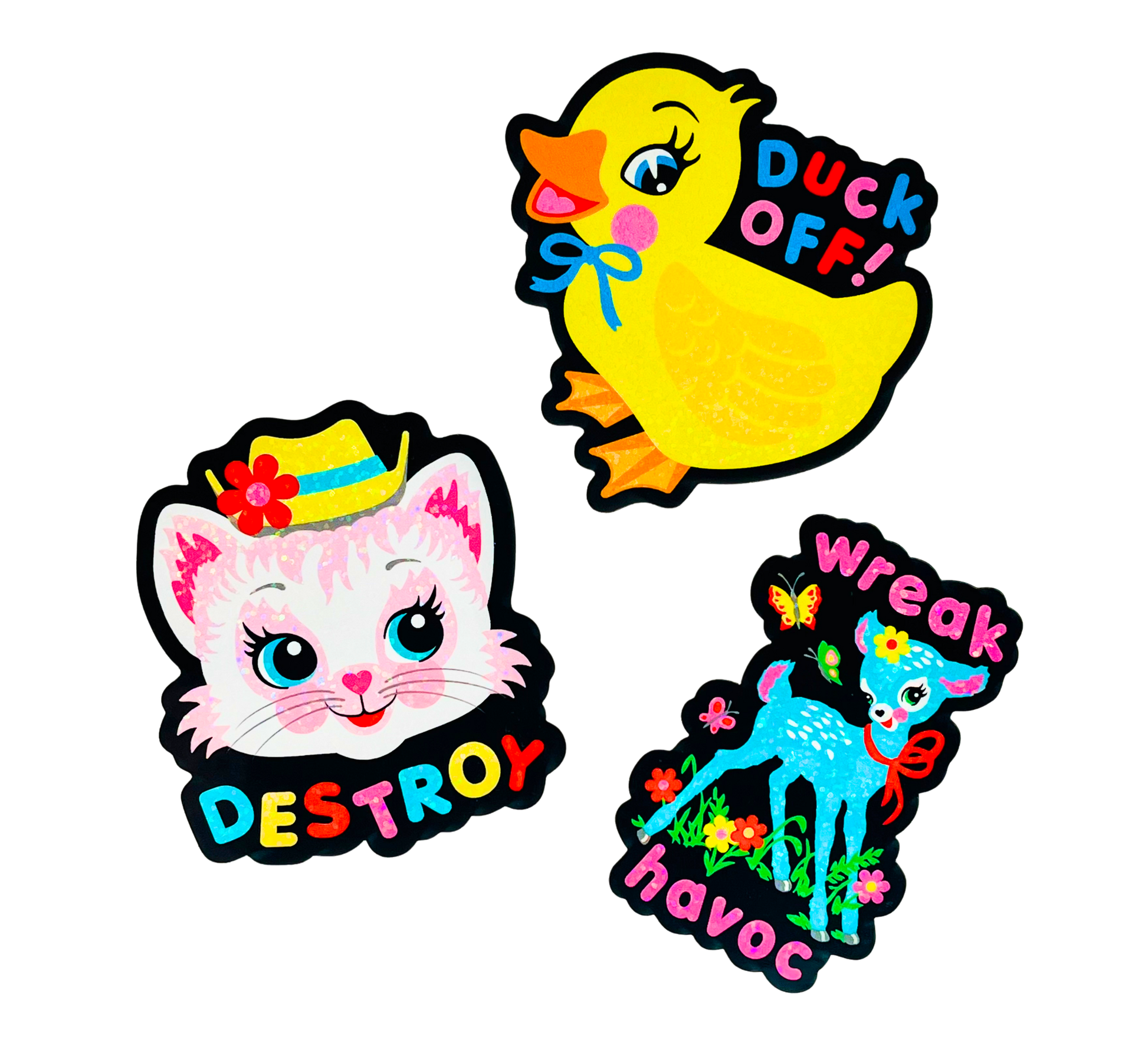This Super Happy Fun Time sticker pack includes three sparkly glitter stickers in smaller 3" versions of the originals.
